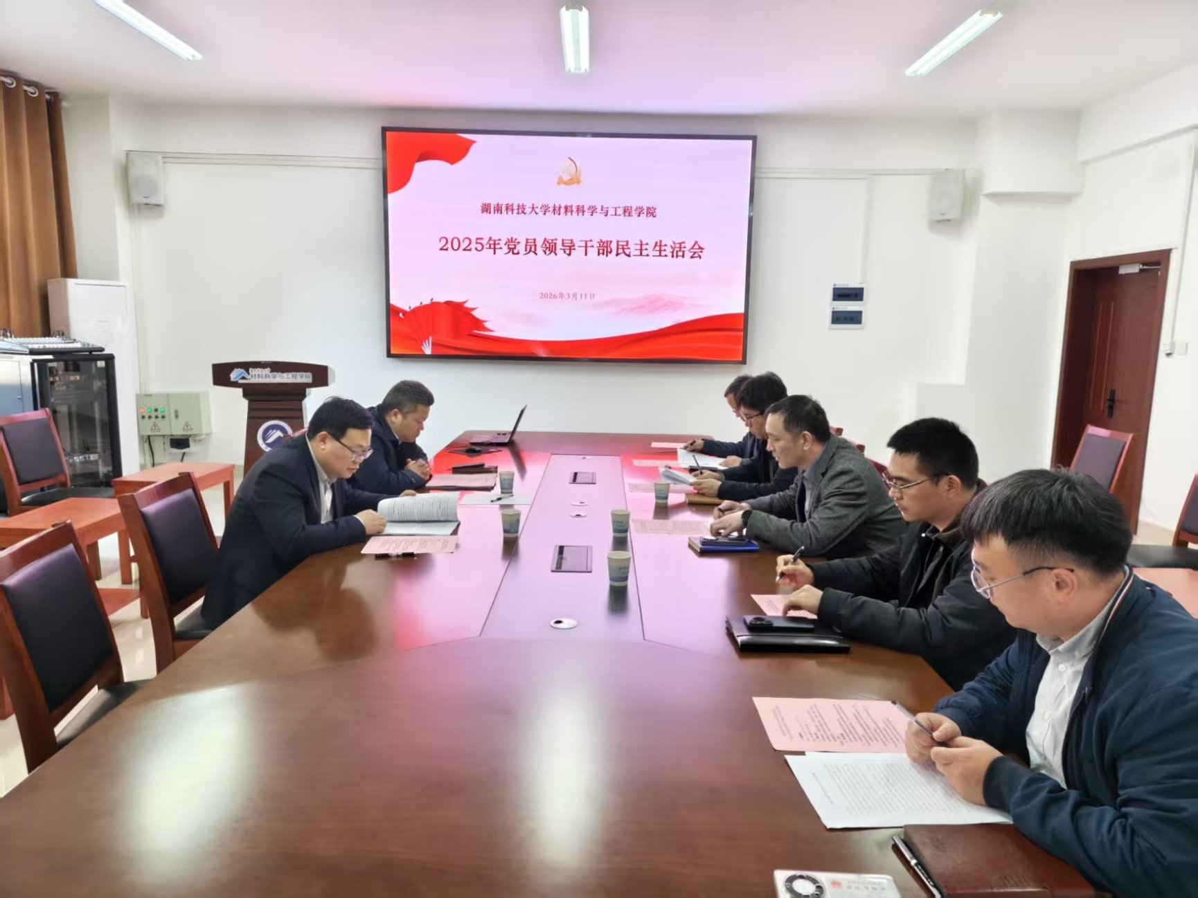 3月11日,学院党委在知行楼A140会议室召开2025年度党员领导干部民主生活会。校党委委员、副校长周虎,人事处副处长皮祖训到会指导,学院党员处级领导干部参加会议,非党员处级领导、副院长周五星,院党委委员、党政办主任何晴列席会议。会议由院党委书记刘清泉主持。
