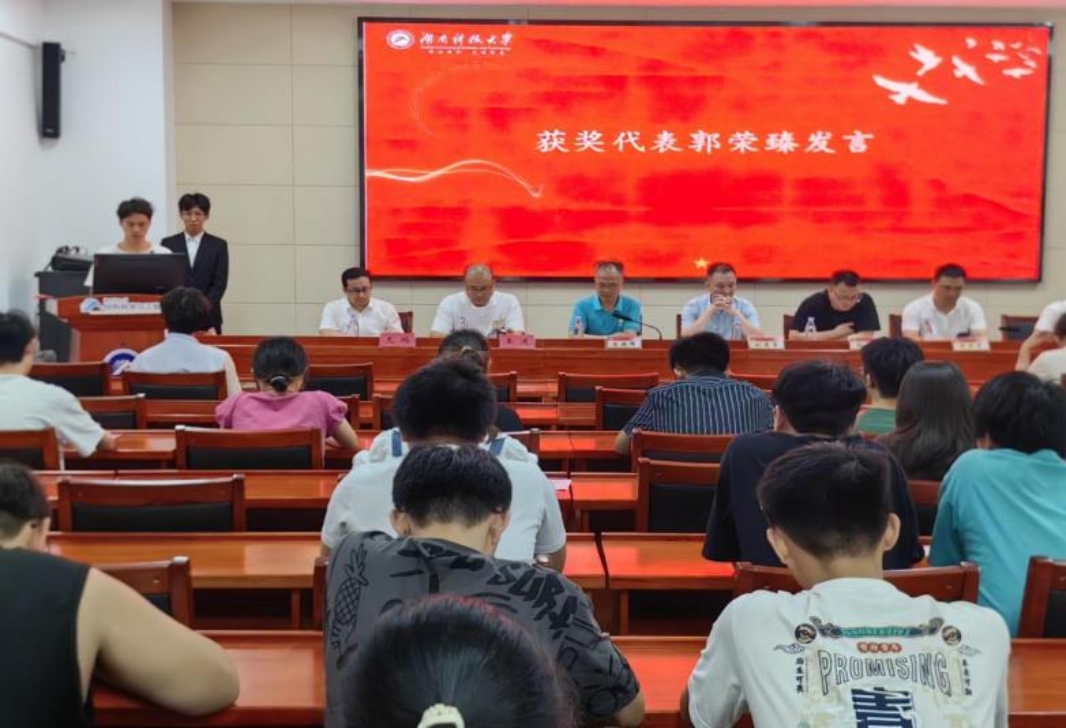郭荣臻同学作为获奖代表发言。他向校友提供本次活动奖金表达衷心谢意,并汇报了自己在学习和科研道路上的心得体会,表示下一步将追求更高目标、全面提升自身素质。