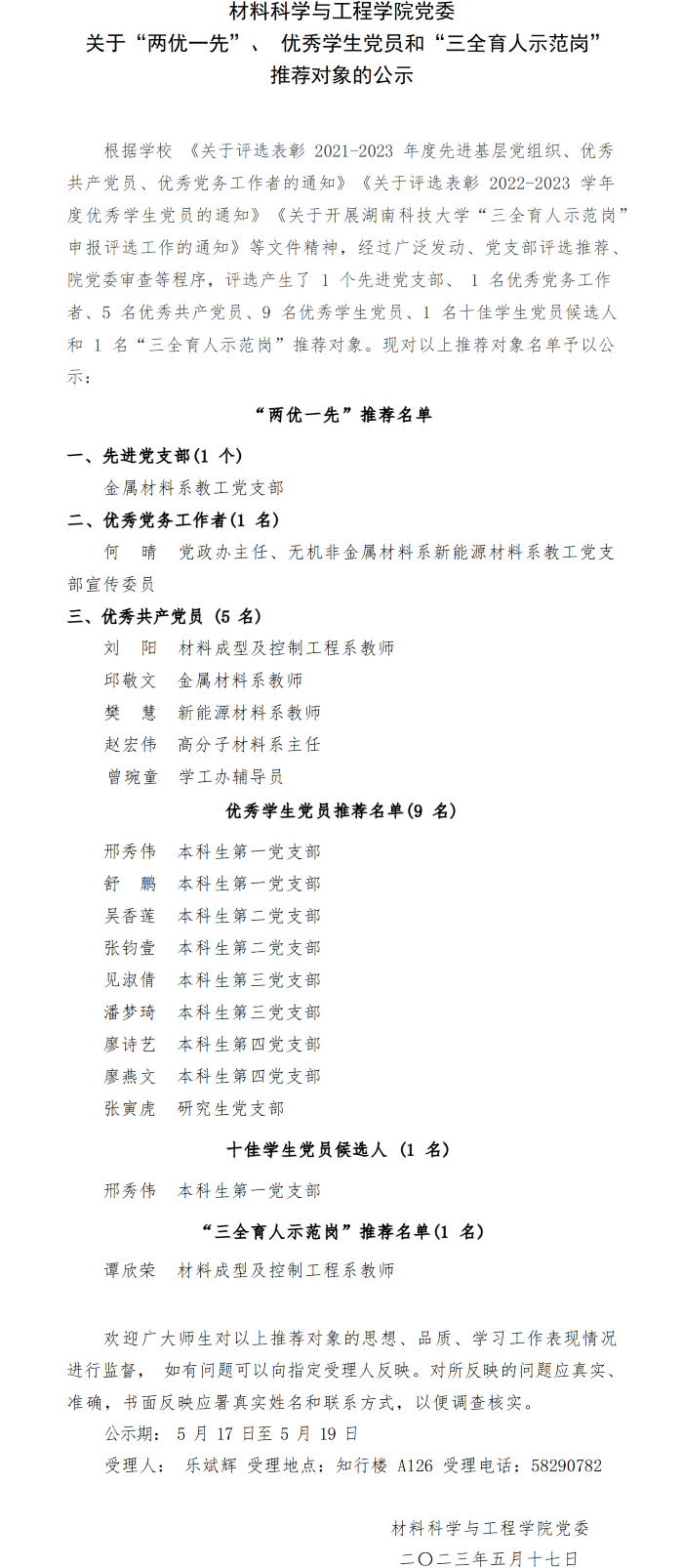 "两优一先"、优秀学生党员和“三全育人示范岗”推荐对象公示