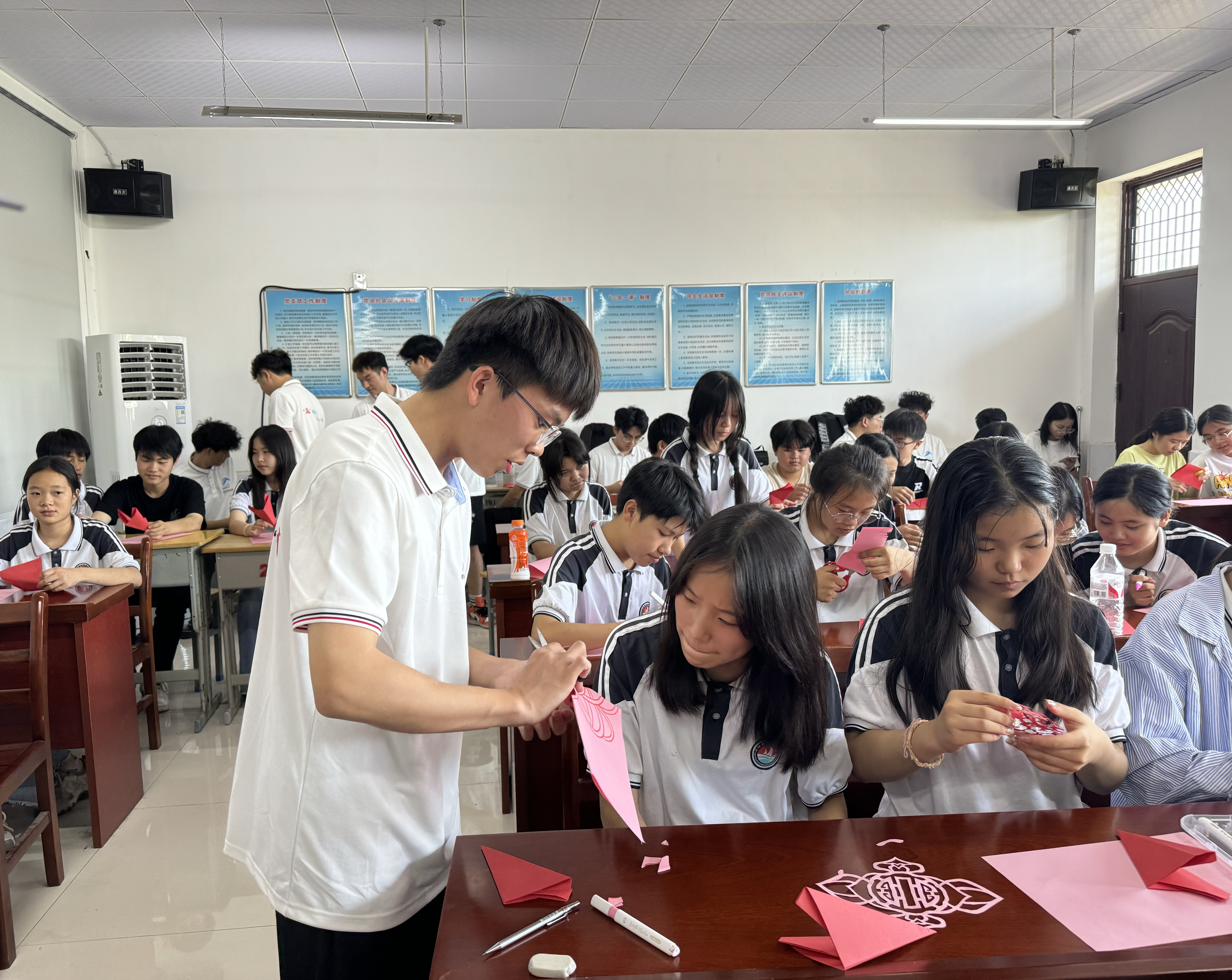 实践团成员向同学们详细介绍剪纸艺术的特点和创作方法,以及剪纸背后蕴含的艺术价值与文化内涵。从折叠、画图案再到裁剪图形,孩子们在志愿者的示范和指引下,将一张张红纸变成了精美的剪纸作品。他们小心翼翼拿着自己的作品,时不时地伸头看周围同学做的剪纸作品。“看,我做的剪纸漂亮不漂亮?”初一年级的张同学骄傲地展示自己的作品。