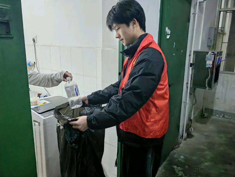 活动当晚,青马学员们身着志愿者马甲,手持垃圾袋,分组前往负责的宿舍区。在收塑料瓶和纸盒时,大家细致入微,认真拆开纸盒、倒净塑料瓶中的水,确保废品净重规范。收集完成后,学员们齐心协力将废品搬运至七区门口,再次仔细分类、打包以便后续变卖。此次回收变卖的金额将进行公开,并用于学院后续志愿活动的开展。
