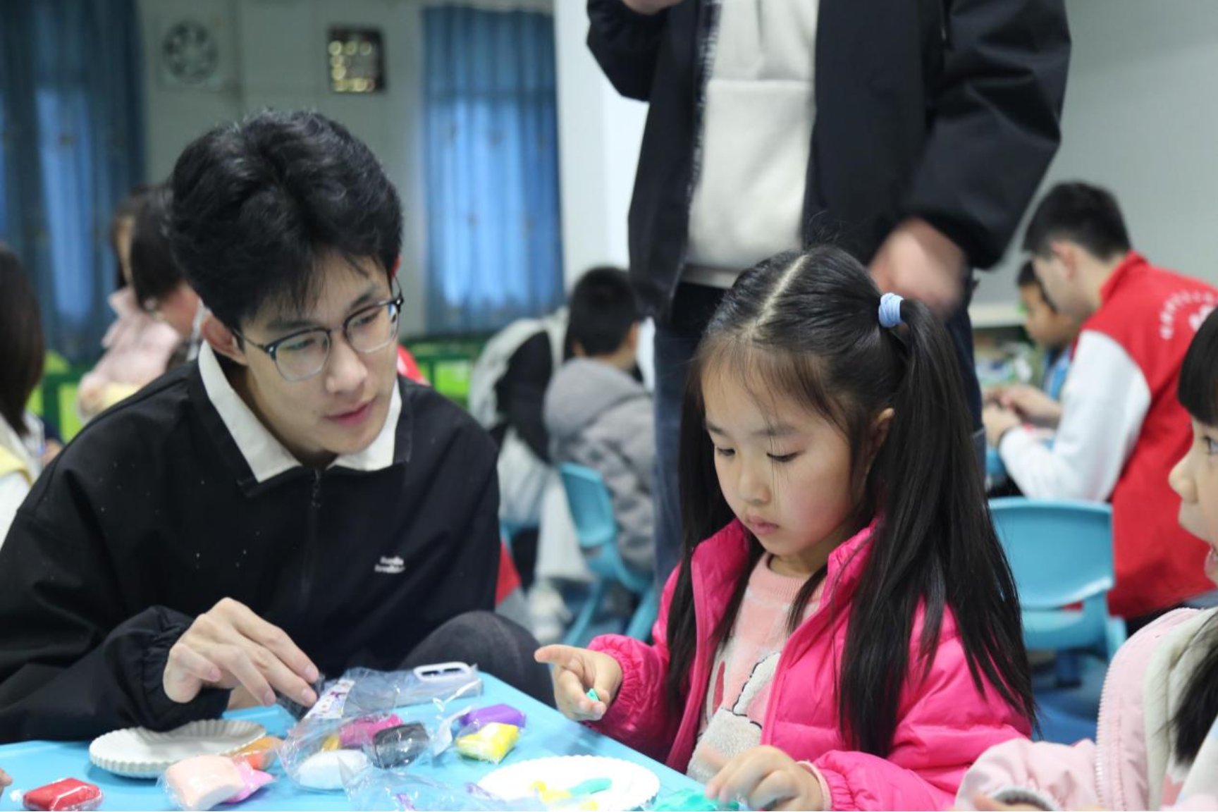 ▲志愿者协助小朋友制作粘土作品