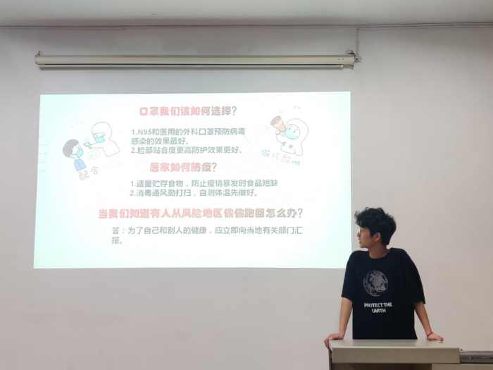 陈孙涛介绍本次PPT大赛的主题——共同抗疫;结合时代背景,深入讲述本次PPT大赛的现实意义,旨在让同学们认识到抗疫形势和抗疫精神。