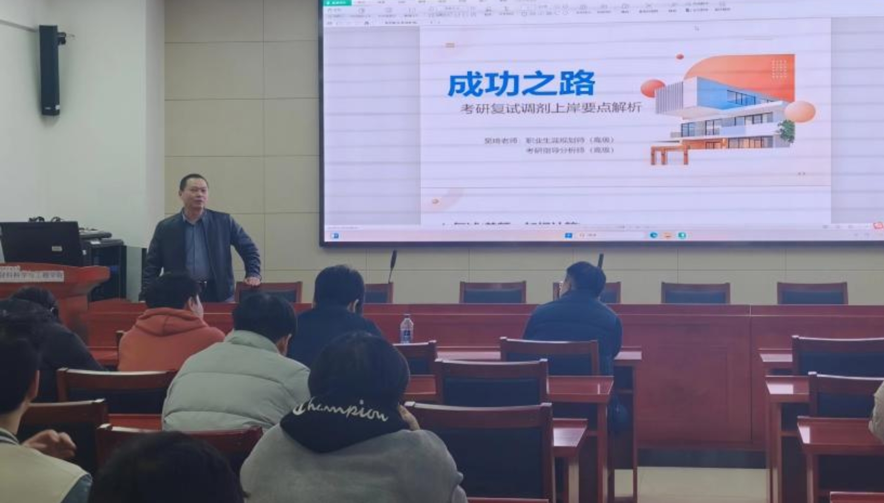 本次指导会由2022级辅导员曾琬童主持。学院党委副书记屠波、副院长刘阳和特邀考研培训老师吴琦出席会议。会议伊始,吴琦结合历年考研复试特点和调剂政策,为在场学子进行了深入细致的讲解。