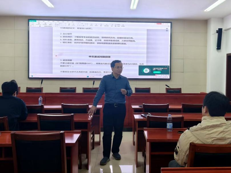 刘阳分析了今年学院研究生招生形势,并叮嘱同学们要回归课本,巩固基础,将专业知识学深悟透,以扎实的基本功应对复试中的各种挑战。
