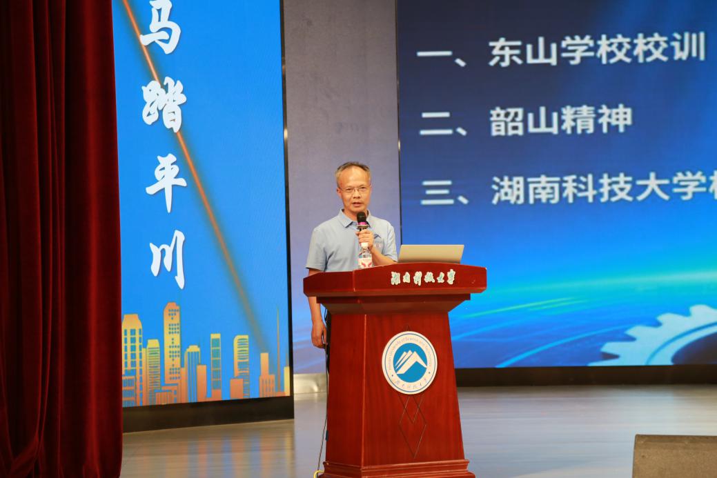 乐斌辉以“赓续优秀文化之脉,树牢材料爱国之志”为主题展开讲话。他详细解读了东山学校校训“公诚勤俭”、韶山精神“为有牺牲多壮志,敢教日月换新天”、科大校训“唯实惟新,至诚致志”的深刻内涵,以及学院“材德兼备,知行合一;材料爱国,材料强国”的核心文化,引导新生领悟精神力量。