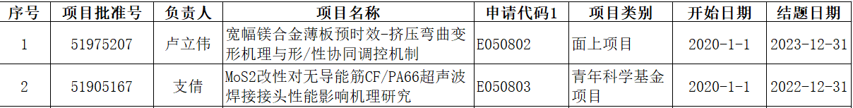 日前,国家自然科学基金委公布了2019年度国家自然科学基金评审结果。bv伟德国际体育官方网站共获批国家自然科学基金2项分别为,由卢立伟老师主持的课题“宽幅镁合金薄板预时效-挤压弯曲变形机理与形/性协同调控机制(面上项目E050802)”;由支倩老师主持的课题“MoS2改性对无导能筋CF/PA66超声波焊接接头性能影响机理研究 (青年科学基金项目E050803) ”。在此,特向获得资助的项目负责人和科研团队表示祝贺!