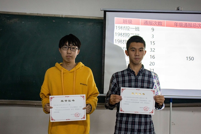 杨行根据1-9周的四个部门通报情况进行分析,他肯定了成绩,指出了不足。希望各班班团加强管理,做好思想引导工作。随后,杨行对首个零通报率的班级--18级材化四班提出表扬,并代表学院给18级材化四班和19级材控二班颁发了“优秀班级”证书。