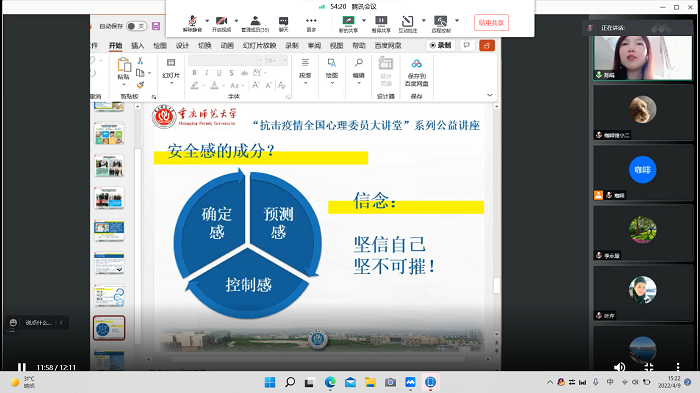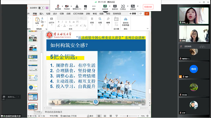 4月9日下午,bv伟德国际体育官方网站心理健康部通过腾讯会议组织心理委员观看“抗击疫情全国心理委员大讲堂”系列公益讲座,各班级心理委员参加。